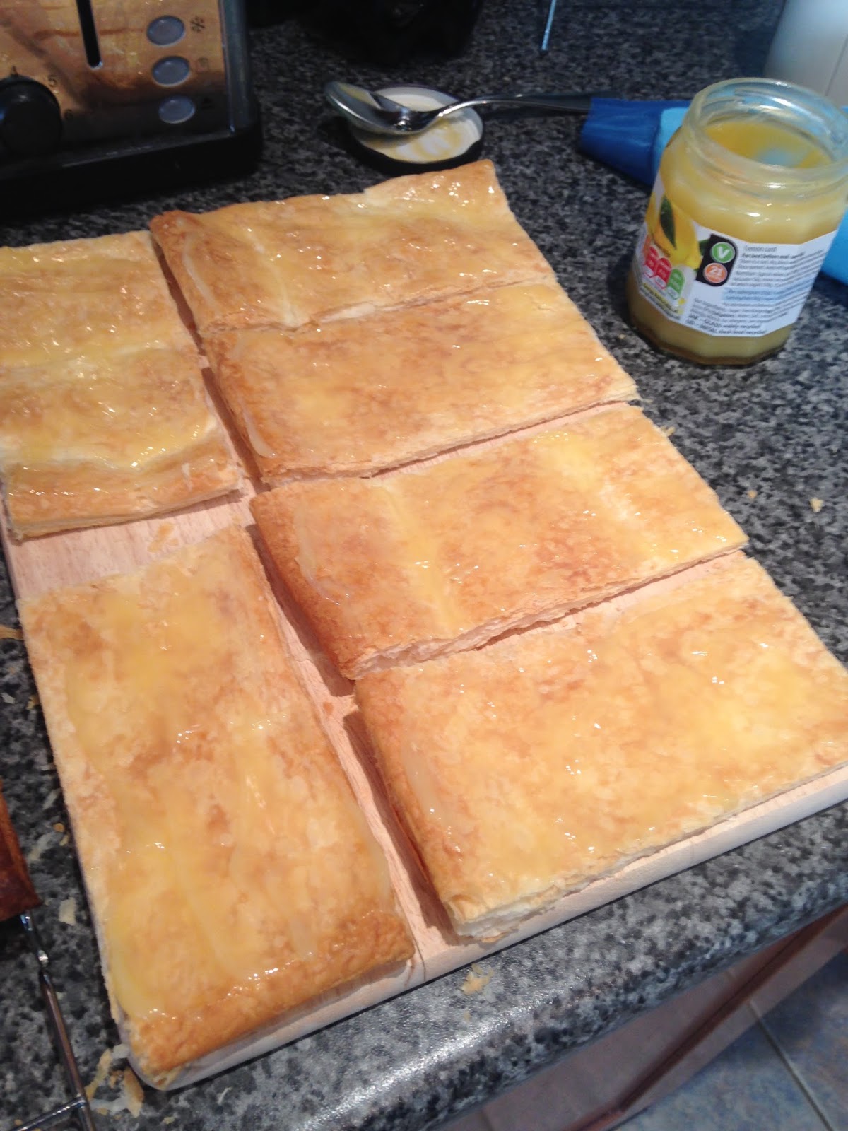 I coated 12 pieces of the pastry with lemon curd. The recipe said to use raspberry jam, but I didn't have any and I preferred using lemon curd instead.