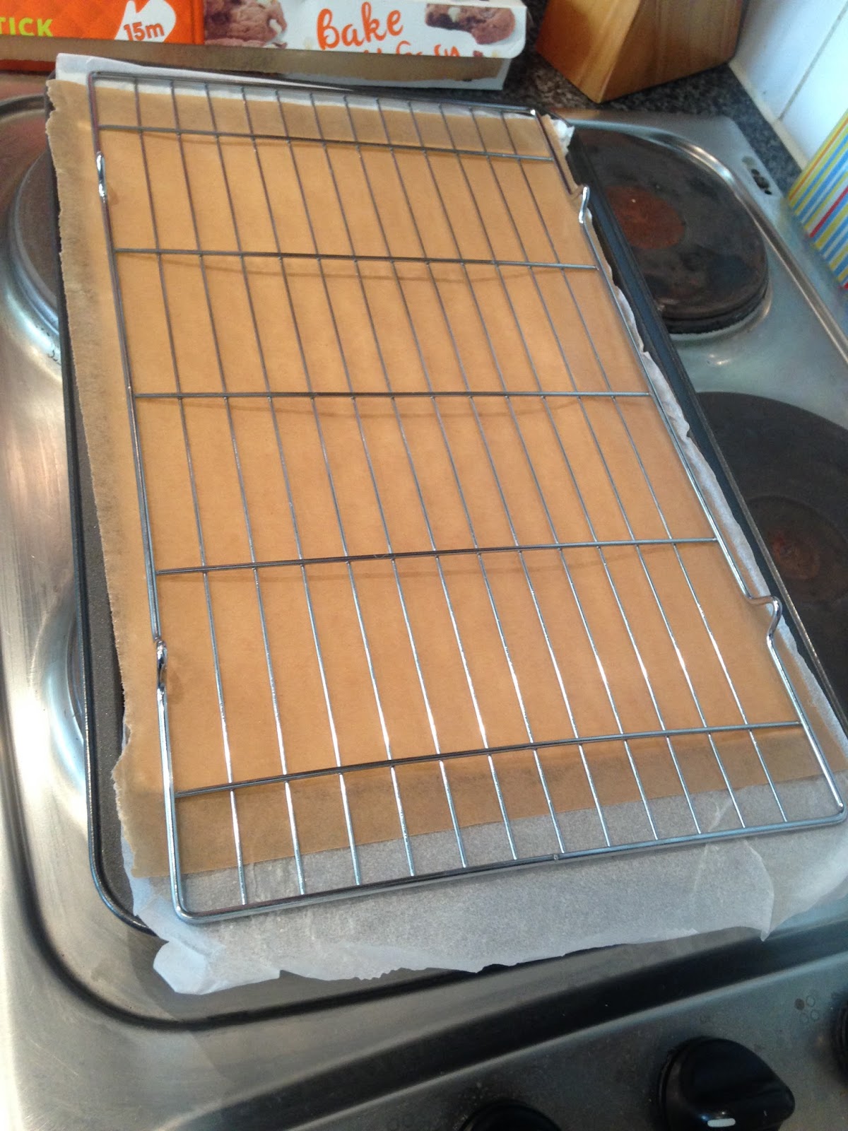 I baked the pastry on 200C/400F/Gas Mark 6 for 15 minutes. I flipped it upside down and baked it again, this time without the cooling rack on top, for 10 minutes.